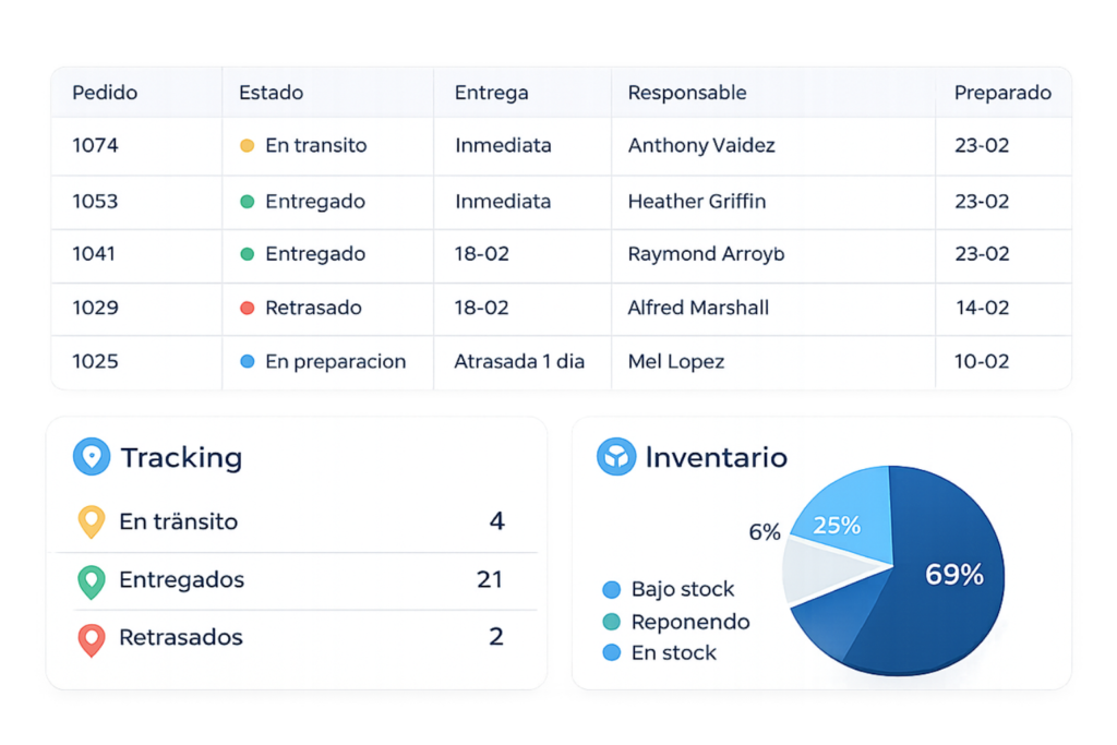 Tracking · Mensajería automática · Stock · Incidencias · Rutas · KPIs logísticos.